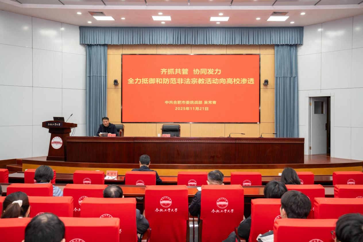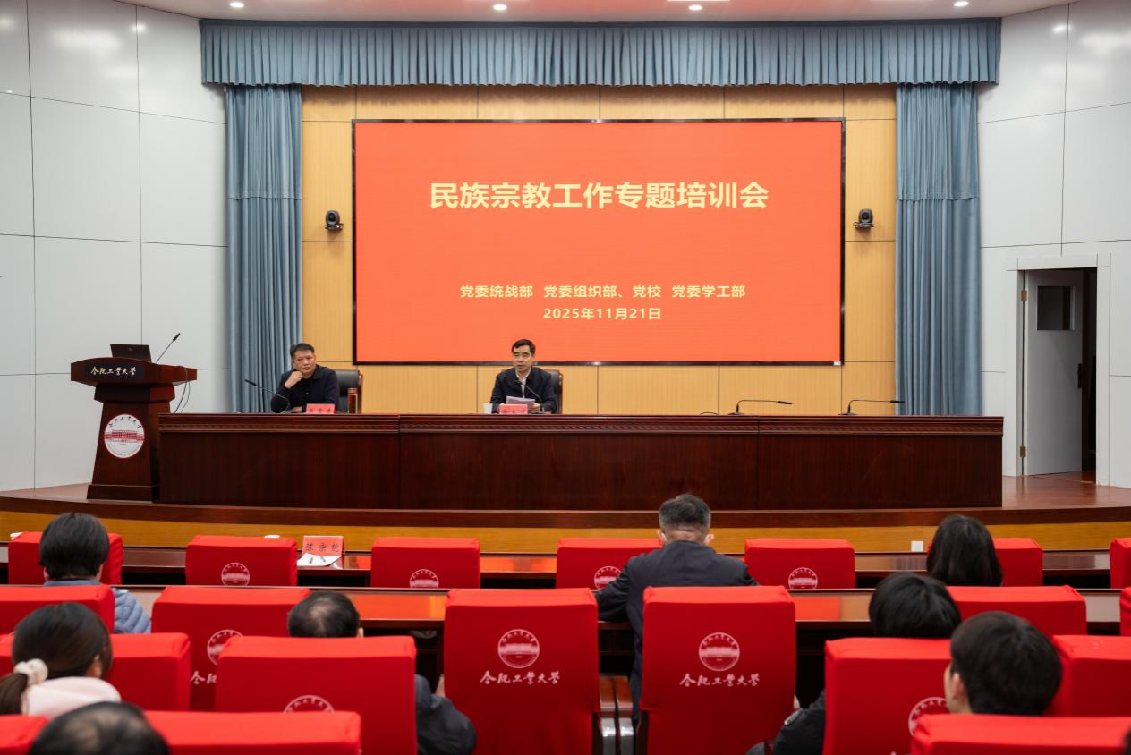 为深入学习贯彻习近平总书记关于加强和改进民族工作的重要思想、关于宗教工作的重要论述和重要指示批示精神,立足大统战工作格局,进一步贯彻落实《党委(党组)落实统战工作责任制规定》,提升学校统一战线工作队伍做好民族宗教工作的能力水平,11月21日,学校举办2025年民族宗教工作专题培训会。中共合肥市委统战部、市民宗局局长吴常青受邀来校作专题报告。校党委常委、统战部部长徐宝才主持专题培训会。