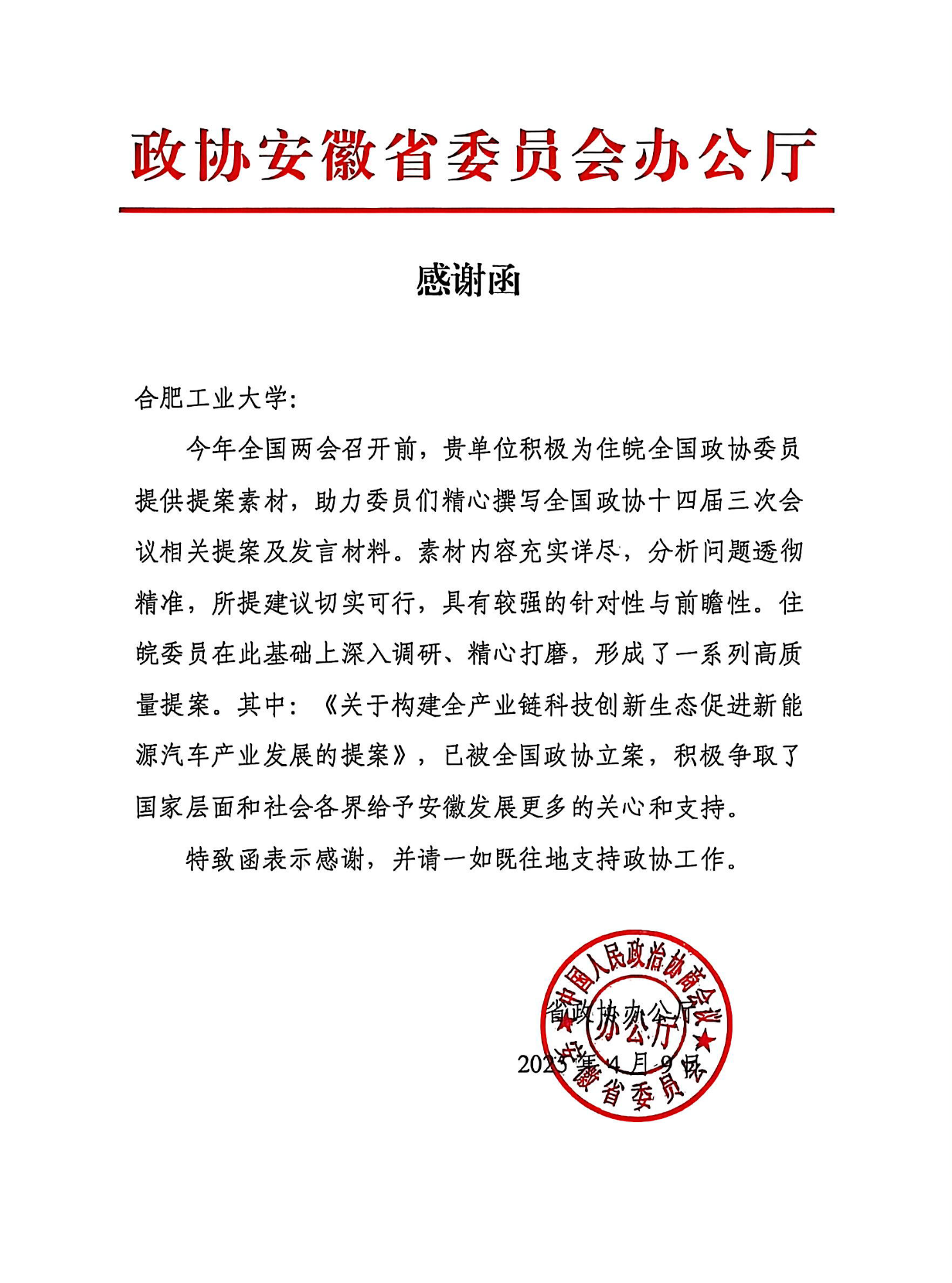 安徽省政协办公厅向我校发来感谢函,感谢我校对省政协建言资政工作的大力支持,对我校省政协委员、常委、九三学社合工大基层委主委卢剑伟教授撰写的有关提案建议给予充分肯定和感谢。