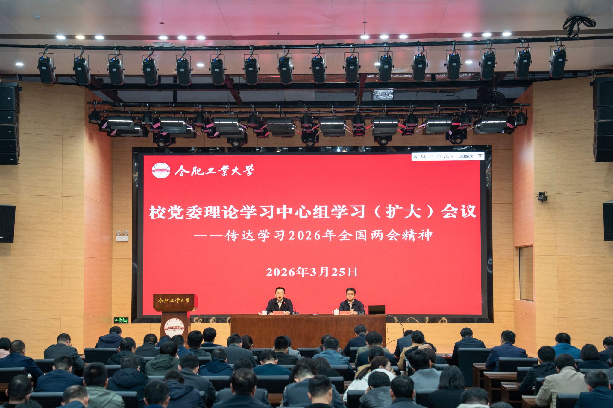 3月25日下午,校党委理论学习中心组召开扩大会议,传达学习2026年全国两会精神。校党委书记于祥成主持会议并讲话,校党委副书记、校长汪萌传达领学习近平总书记在全国两会期间的重要讲话精神,全国人大代表、计算机与信息学院教授魏臻传达全国两会精神并交流履职情况和参会感受。