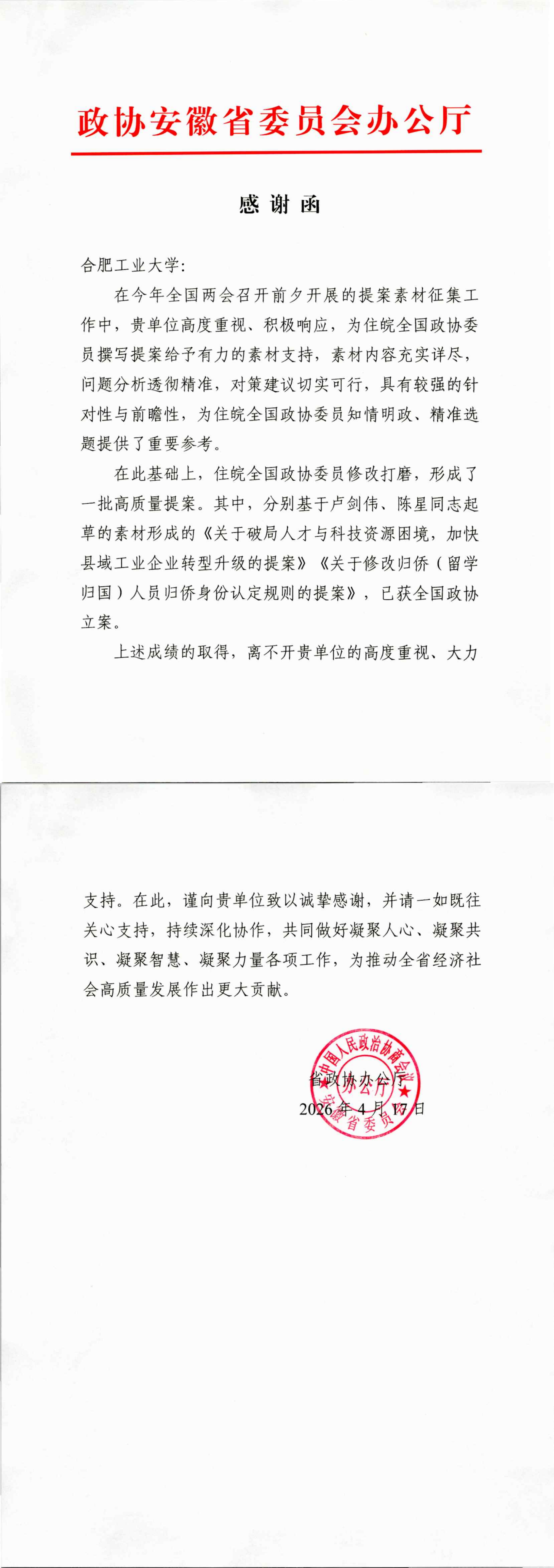 近日,安徽省政协办公厅向我校发来感谢函,感谢我校对省政协建言资政工作的大力支持,对我校省政协委员、常委、九三学社合工大基层委主委卢剑伟教授,校侨联委员陈星老师撰写的有关提案建议给予充分肯定和感谢。